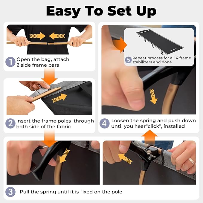 - Ultralight & Compact for Easy Carrying: Weighing only 4.9 lbs and folding down to a compact 14 x 5.1 x 5.1 inches, this ultralight camping cot is made for adventurers who need to pack light. Perfect for backpacking, hiking, and travel — toss it in your trunk or backpack without taking up precious space.
