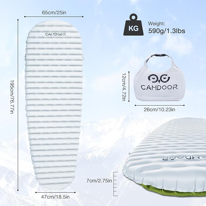 - 【SGS Certified High R-value】The Camdoor camping sleeping pad is SGS professionally tested and certified with a high R-value of 6.8. 3.93” Horizontal Insulating air Chambers will effectively distribute your weight on the sleeping pad camping while preventing the ground from sucking the heat out of your body, Keeps you warm in extreme weather, which makes Camdoor sleeping pad backpacking suitable for 4 season.