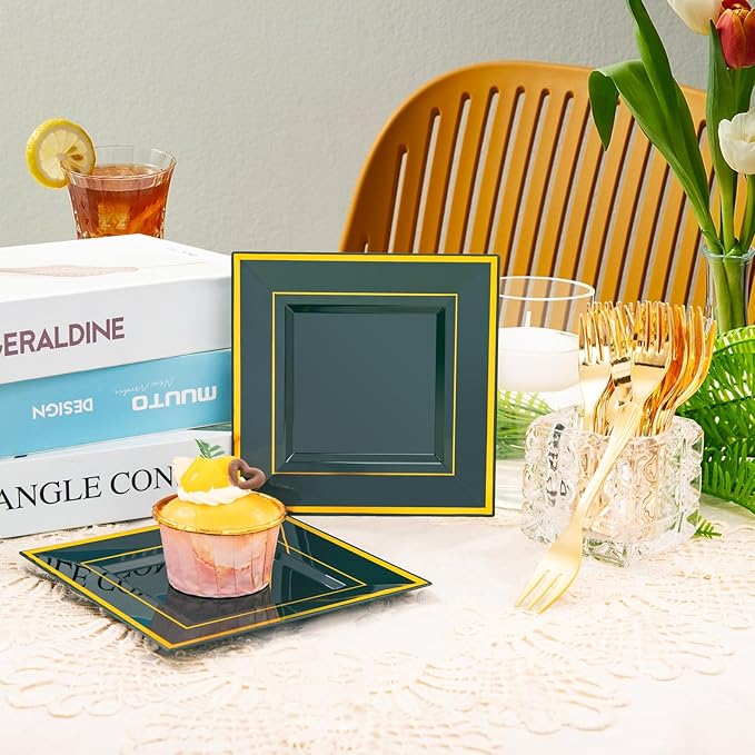 - ELEGANT TABLEWARE SET: Our 100-piece green and gold plastic plates includes 5-inch green plastic dessert plates disposable and matching 6-inch gold plastic forks, designed to elevate the style of your dining table with a modern and sophisticated look. Guests will marvel at the visual delight this beautiful cutlery set brings to any
