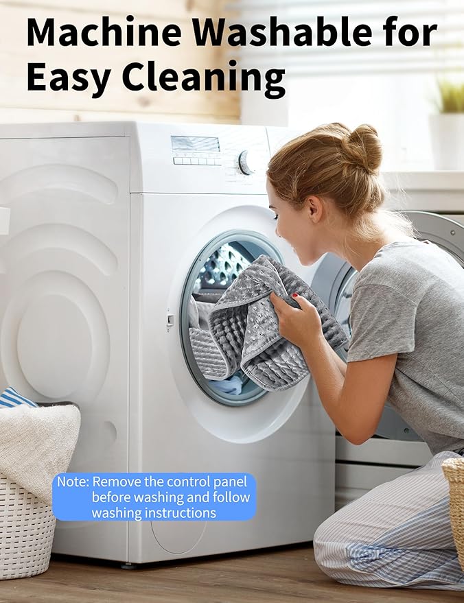- Machine Washable: The silky anti-pilling materials are machine-washable on the delicate cycle, helping to maintain the tidiness and softness of the heating pad for years. Please remember to remove the cable/controller before washing the heated pad.