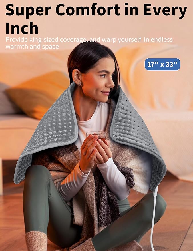 - King Size for Full Body Comfort: The extra-large 33''×17'' heating pad is designed for full-body use, promoting blood flow, relieving pain, and relaxing muscles.