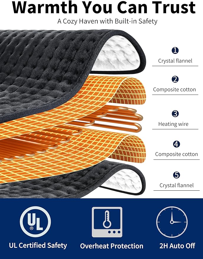 - 2H Auto Shut Off & Overheating Protection: For safety, the electric heating pad automatically shuts off after 2 hours to prevent overheating. Overheating protection settings ensure a secure and user-friendly experience. UL certification guarantees safety.