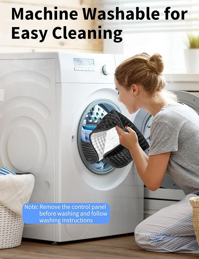 - Machine Washable: The silky anti-pilling materials are machine-washable on the delicate cycle, helping to maintain the tidiness and softness of the heated pad for years. Please remember to remove the cable/controller before washing the heated pad.