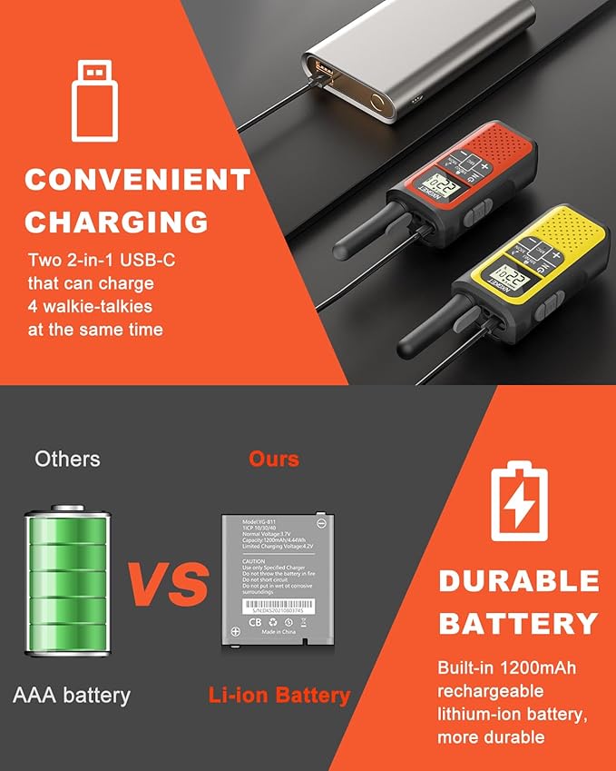 - DURABLE LITHIUM BATTERY: NXGKET FRS two-way radio walkie-talkie comes with two 2-in-1 USB C charging cables, you can charge four walkie-talkies at the same time anywhere, built-in 1200mAh rechargeable high-life and safer lithium-ion battery, providing overcharge, overvoltage, and short circuit protection. Automatically shut down after 3-4 hours of long-term non-use to save power, and restart it when needed. The walkie-talkie can be used for 3-4 days after fully charging