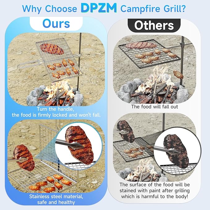 - The best choice: Our bbq over fire pit grill is a good choice for camping to cook over the open fire. Perfect for outdoor camping, hiking, party and picnic. You can easily enjoy steaks, hot dogs, veggies,corn, sweet potatoes and any other food you like, You can even make coffee, and have a great time camping with your friends or family