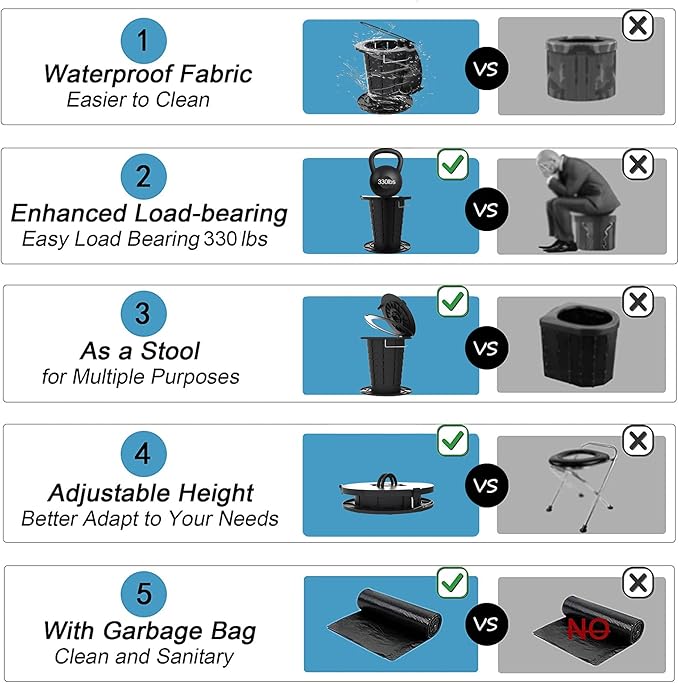 - 【HIGH QUALITY AND DURABLE】The camping toilet is made of high-quality ABS plastic, giving the toilet extraordinary stability and durability. Weighs only 2.8 pounds and can hold up to 330 pounds. Adult retractable toilet makes for a more relaxing experience