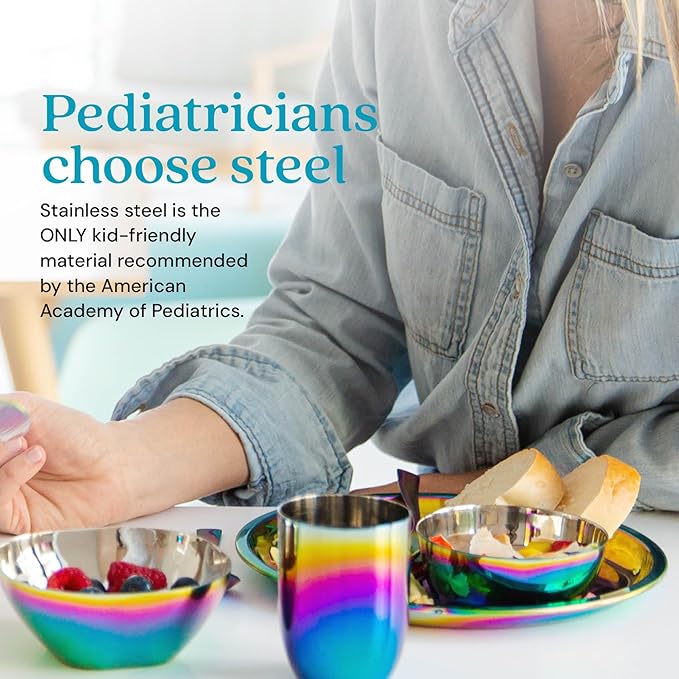 - ๐๐ฅ๐๐ฌ๐ฌ๐ข๐ ๐๐ญ๐ฒ๐ฅ๐ & ๐๐จ๐ฅ๐จ๐ซ ๐๐๐๐๐ญ๐ฒ: These rainbow stainless kids plates combine bright style with safety for toddlers and older kids. Families love these stainless steel kid plates; we care deeply about childrenโs health and chose this process for its safety, making them the go-to metal plates for kids