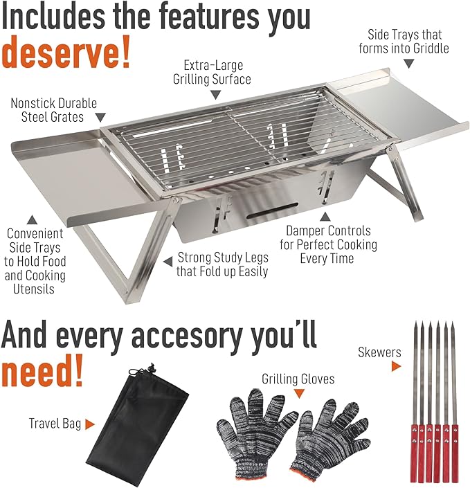 - Complete Cooking Set: The Fold N Go Grill includes the grill itself, heat-resistant grilling gloves, 6 Brazilian skewers, and a convenient carry bag for easy transport.