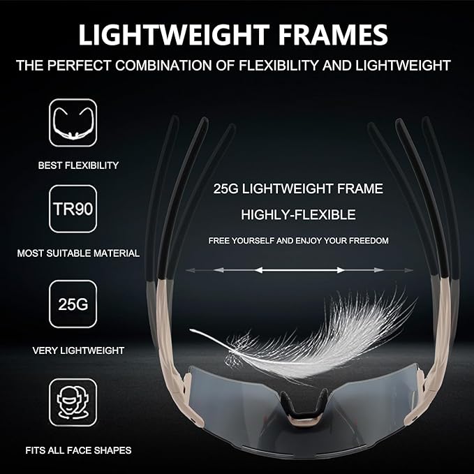 - LIGHTWEIGHT DESIGN:Our sports sunglasses made of durable and strong frame and uv protection lens lightweight design,weighs only 25 g that you can’t feel you was wearing it;The frame can bend under pressure and contour your face comfortably;Ideal for usage by motorcycle ,cycling, driving, running, baseball,fishing, racing, golf and climbing, trekking or other outdoor activities