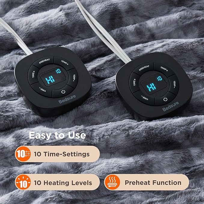 - CUSTOMIZABLE WARMTH: Fast-heating technology with 10 heating levels and 10 time-settings for personalized comfort. Queen size has preheat function, so just place on your bed 25 minutes before sleep for a toasty welcome this winter