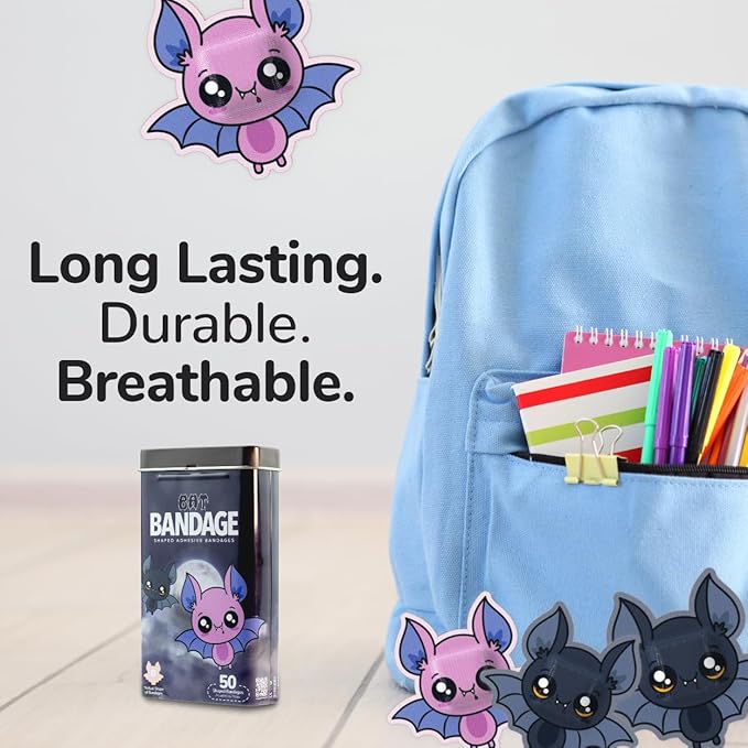 - BAT HALLOWEEN BANDAGES: This 50 piece tin of frightfully fun Halloween Bat bandages is great for putting a smile on kids' faces while protecting wounds such as cuts, scrapes, and burns, and come in 2 styles; sticky bandages are perfect for kids and adults alike, and also for school nurses and pediatric doctors