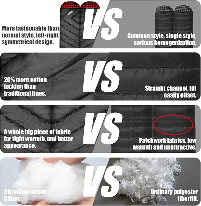 - Warm Flannel Cotton: Soft and comfortable poly-flannel lining, and the sleeping bag is filled with hollow cotton, Soft and cozy, providing warmth and comfort no matter what scenario you're in.