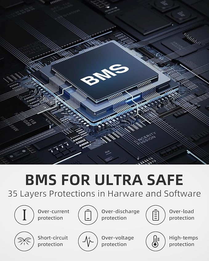 - 【35-Protection BMS for Ultra Safe】We always believe that power station safety is the top priority for all, we used multiple advanced technologies to provide stable power, including heat dissipation system, anti-electric shock, anti-electrolysis , and immersion detection technology and protections in hardware and software.
