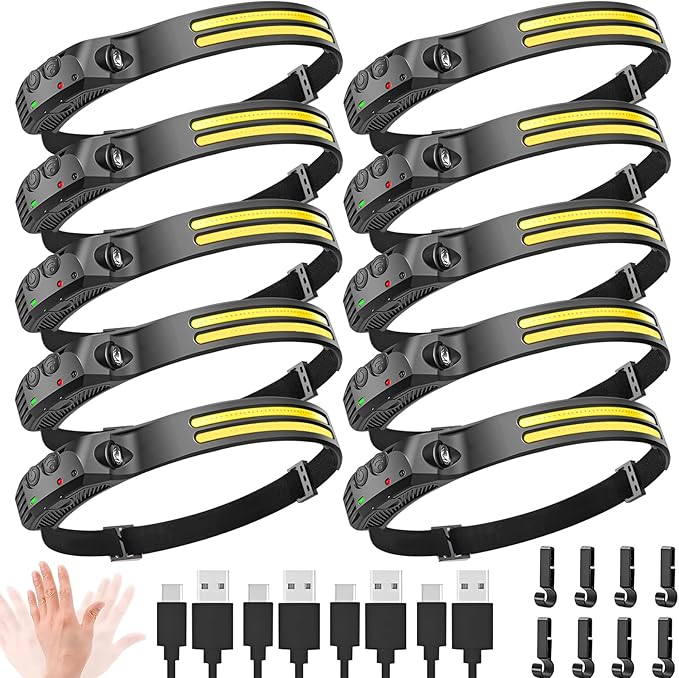 New LED Headlamp Rechargeable, 230° COB Super Bright Head Lights for Forehead, 6Mode Hard Hat Light for Adults, USB C Headband Flashlight for Work, Hiking, Running, Camping (10Pack)