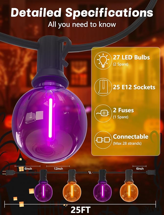 - Connectable String Lights: The G40 LED orange purple string lights feature an end-to-end connection design, up to 28 strands can be connected to cover a large area(total string light can not exceed 432 watts).This connectable outdoor lights totally has 25*E12 hanging sockets, 6'' lead with male plug, 6'' lead with female plug, 12'' spacing between Bulbs, total length 25 feet
