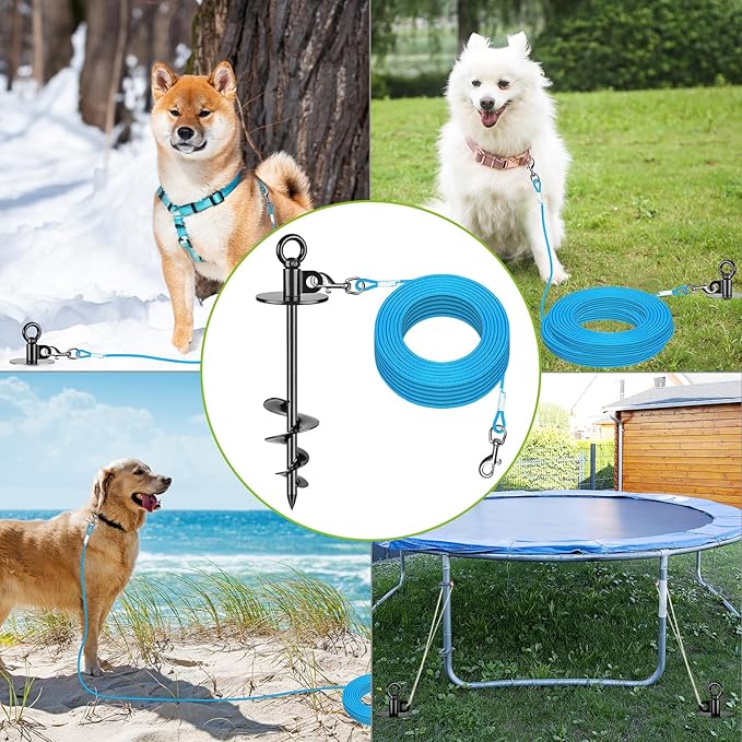 - 【NO TANGLE】The tie out stake has a 360° swivel ring on the top of the dog stake with 2 360° swivel hook on the long dog leash to prevent the cable from getting tangled or twisted, allowing your furry friend to move around freely and comfortably