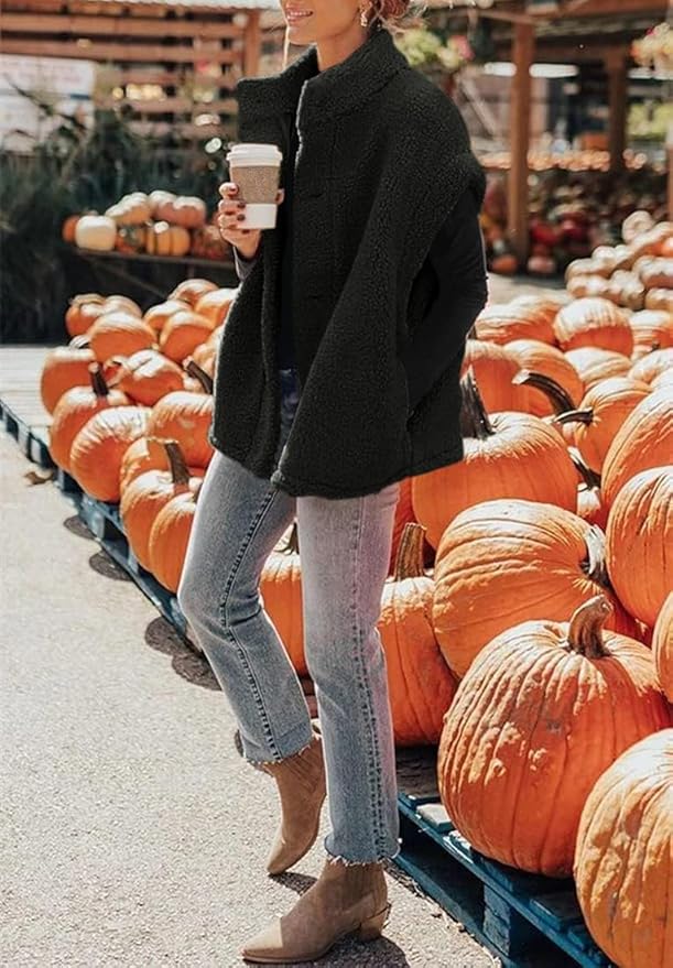 - Features: Stand collar, sleeveless, thigh-length, baggy style, side pockets, solid color, sherpa vest for women, casual loose fleece vest for women