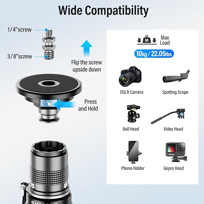 - 【Quick Lock/Release Head 】: Both the monopod top and tripod base feature the same innovative quick-release system. Pull down the collar to release the top plate or insert the top plate to lock your device automatically. Only 2 steps to switch different devices in seconds.