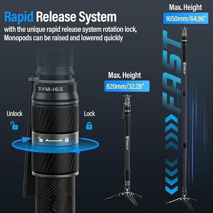 - 【Lightweight Carbon Fiber Monopod】: SVM-165 monopod with 36mm max tube, weighs 3.4lbs/1.52kg and load up to 22lbs/ 10kg, which is ideal for activity shooting where you can move it easily to capture images at the appropriate angle.