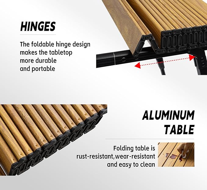 - Convenient Storage The aluminum slatted tabletop rolls up, and the foldable legs with anti-slip feet come with a carry bag, making it compact for easy storage and transport. Perfect for camping, tailgating, or backyard use.