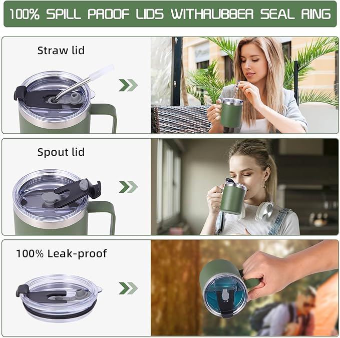 Volhoply 12oz Insulated Leakproof Coffee Mug with Flip & Straw Lid Bulk 4 Pack,Double Wall Vacuum Stainless Steel Travel Tumbler Cup with Handle,Camping Mugs Keep Cold/Hot(Army Green,4 Set)