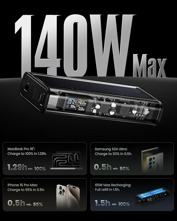 - 140W Max Output: 100W USB-C and 40W USB-A ports charge two devices. MacBook Pro from 0 to 50% in 40 minutes