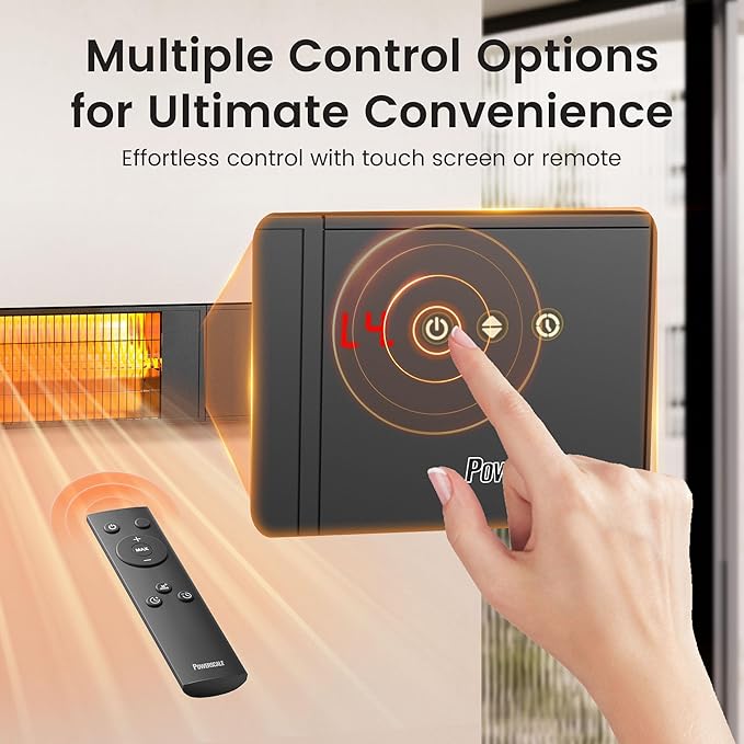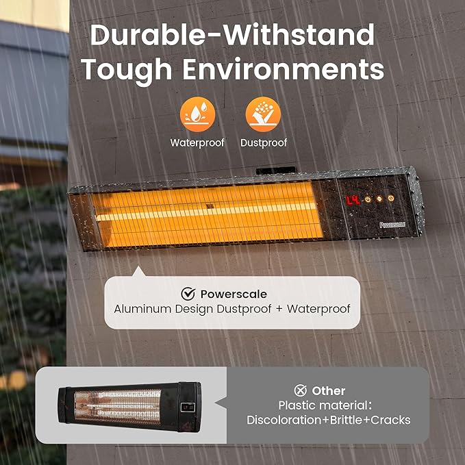 - POWERFUL HEATING FOR INSTANT COMFORT: Patio heater experiences powerful 1500W heating capacity with advanced graphene technology. The outdoor heater heats up instantly in just 0.5 seconds, electric patio heater delivering warmth up to 12 feet. Perfect for quick relief from the cold, infrared electric heater ensures your comfort in no time—no waiting, no shivering, just immediate, efficient warmth! This makes it an ideal infrared outdoor electric space heater—fast and powerful heating. VERSATILE INSTALLATION FOR ANY OUTDOOR SPACE: Wall-mounted heater lets you enjoy flexible installation with two mounting options—hang it from the ceiling for wide coverage or mount it on the wall for targeted heating, making it perfect for any outdoor space. Its hassle-free assembly requires just 3 simple steps, with most components pre-installed for quick setup. Suitable for various settings like gazebos, patios, or even as a garage heater, it adapts to your needs for both style and functionality. CUSTOMIZED HEATING EXPERIENCE AT YOUR FINGERTIPS: The 36-hour timer function, 4 adjustable heat levels, and memory function allow you to customize your heating experience. You can set the time and heat level according to your preferences. The outdoor space heater turns off automatically when the time is up, and the next time you start it, the patio heaters for outdoor use will automatically adjust back to the last heat level used. Enjoy a personalized heating experience tailored to your liking. SAFETY-FIRST DESIGN FOR OUTDOOR COMFORT: Designed with a modern aesthetic and your safety in mind, this radiant heater features overheating and tip-over protection, automatically shutting off power in risky situations to keep you and your family safe. These outdoor heaters for patio provide the ideal heating solution for a gazebo, balcony, BBQ area, or as an infrared heater. Its design and safety features make it perfect for outdoor comfort and peace of mind. MAXIMUM POWER OF 1500W: Due to the standard 110V US electrical outlet, the heater operates at a maximum power of 1,500W. In extremely cold weather conditions, the heater may have limited ability to warm the surrounding outdoor area effectively. Ideal for moderate to chilly climates for optimal performance