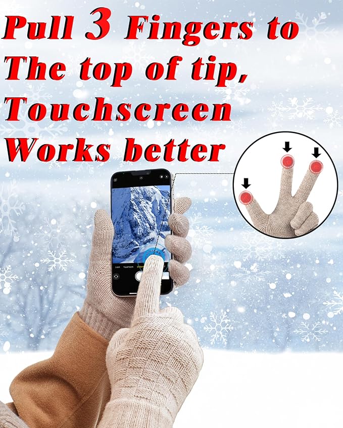 - [3-Finger Touchscreen] Unique 3 fingers screen-touch design makes your hands warm when you use your smart phone and touch screen devices in winter.Please MAKE SURE to wear to the top of Each Finger,especially the 3 Touch screen Fingers,must be filled with our fingers,so that this Touch screen function will be Very Effective.