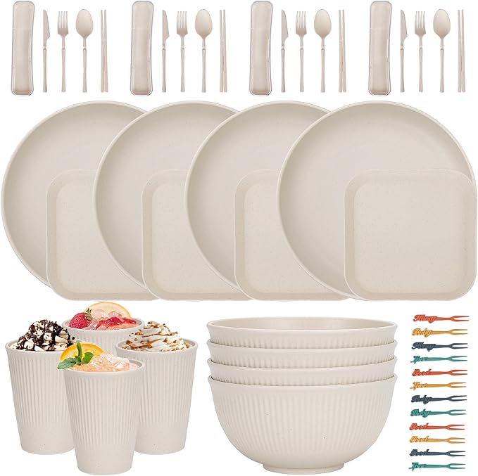 48 Pcs Dinnerware Sets, Unbreakable Plates and Bowls Sets, Reusable Dinnerware Sets for 4 People, Travel Camping Picnic Home Party Cutlery Set, Dishwasher Microwave Safe Dishes