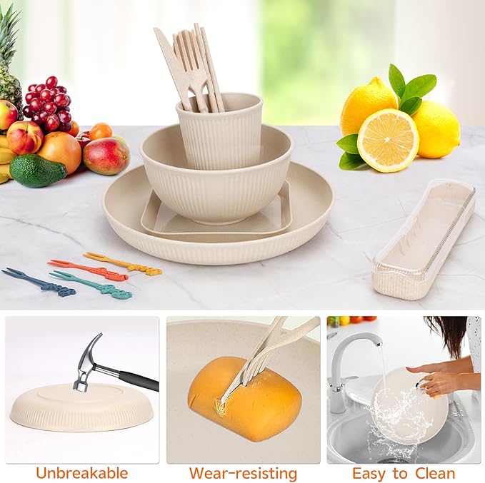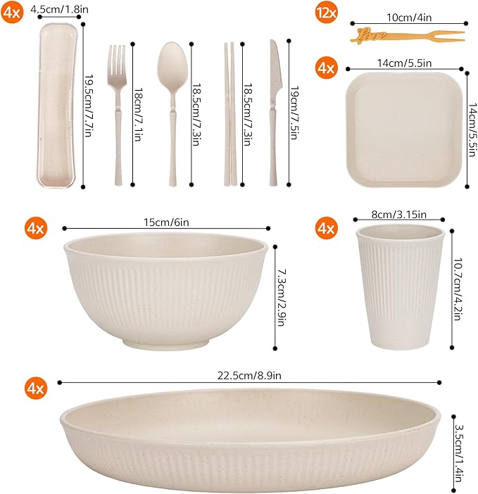 - 【Lightweight Dinnerware Sets】48-piece camping set for 4 people, includes 4 pieces each. 15cm bowls x 4, 22.5cm salad plates x 4, 14.5cm dessert plates x 4, 400ml mug x 4, knife, fork, spoon and chopstick combo x 4, 10cm fruit forks x 12.