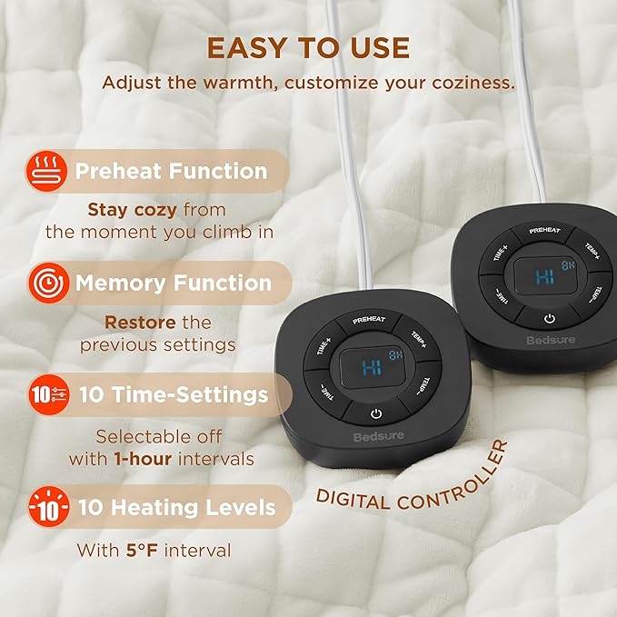 - Easy to Use: This queen size electric blanket with dual control guarantees comfort for thermally incompatible couples. Preheat function conforms to changes in body temperature, keeping you warm and comfortable all night without feeling dry. Memory function restores the previous settings, tailored to your own preferences