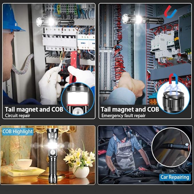 - Special Feature : Lightweight & Pocket-Sized,Easy to Use, Anti-Roll Body, Smart one key Turn-off,4 Operating Modes (High / Low / Emergency/ COB sidelight), Tactical Switch, 360° COB work Light, Super Bright, Magnetic ,Rechargeable , Zoomable, Water Resistant, COB sidelight , Weather & Shock Resistant Lightweight & Pocket-Sized,Easy to Use, Anti-Roll Body, Smart one key Turn-off,4 Operating Modes (High / Low / Emergency/ COB sidelight), Tactical Switch, 360° COB work Light, Super Brig… See more