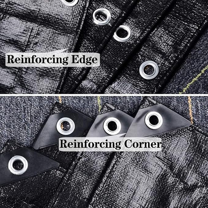 - TIE IT DOWN EASILY:14x16 Tarp with grommets, which are small rust proof aluminum rings along the edges of the tarp.These are used to attach the tarp to ropes, bungee cords, or other fasteners. The edges of outdoor tarp can be reinforced with extra layers of material to prevent tearing or fraying,making them more durable and easier to handle.PP protective layer is added to the four corners of the waterproof tarp to make the plastic tarp stronger and not easy to be damaged by pulling.