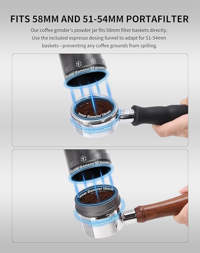 - ๐ตCapacity: The single dose coffee grinder's powder compartment, holding up to 65g of coffee powder, is ideally designed for spill-free filling of a 58mm filter basket, making it perfectly compatible with espresso machines. It can grind 30g of beans at once or 65g with the removable rubber bellows, providing enough coffee for 4 cups or for a 1000ml French press. Compatible with worldwide voltage 100Vโ240V (including 220V).