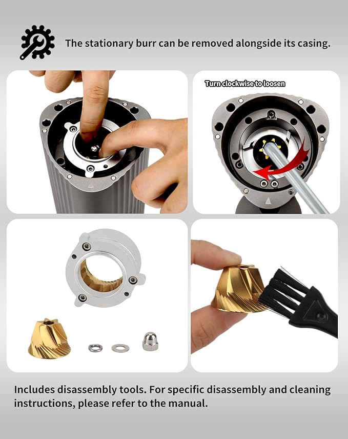 - ๐ฏDurable Material: The high-strength, wear-resistant 420 stainless steel conical burr of this espresso grinder is precision-crafted using a five-axis CNC machine, enhanced with a titanium nitride (TiN) coating for greater hardness and reduced powder adhesion. Its unique Reuleaux Triangle-shaped body offers a space-saving, efficient, and long-lasting design.