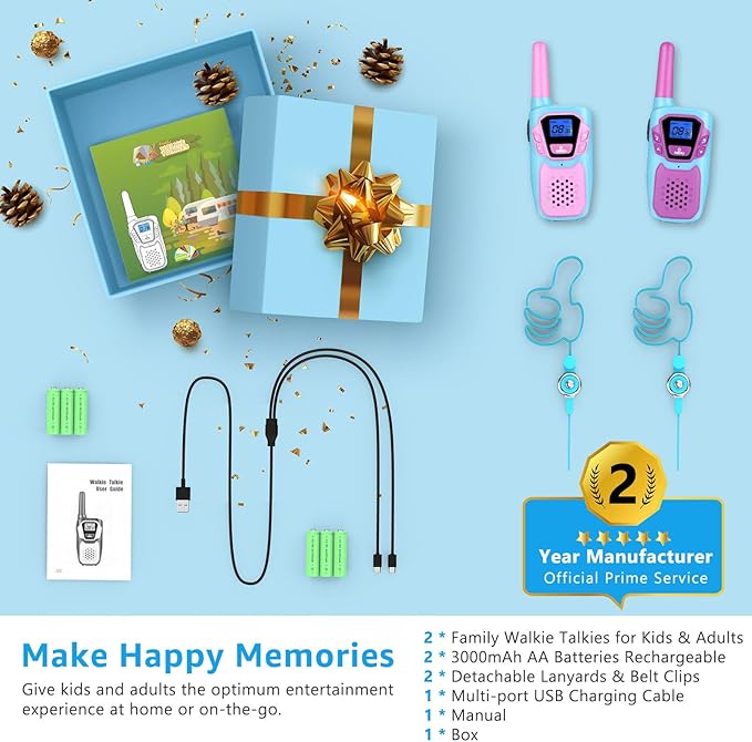 - Included Components : 1 * Manual & 3 Year Manufacturer Service, 1 * Multi-port USB Charging Cable, 2 * 3000mAh AA Batteries Rechargeable, 2 * Detachable Lanyards & Belt Clips, 2 * Family Walkie Talkies for Kids & Adults 1 * Manual & 3 Year Manufacturer Service, 1 * Multi-port USB Charging Cable, 2 * 3000mAh AA Batteries Rechargeable, 2 * Detachable Lanyards & Belt Clips, 2 * Family Walkie Talkies for Kids & Adults