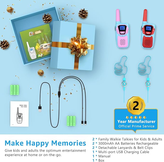 - Included Components : 1 * Manual & 3 Year Manufacturer Service, 1 * Multi-port USB Charging Cable, 2 * 3000mAh AA Batteries Rechargeable, 2 * Detachable Lanyards & Belt Clips, 2 * Family Walkie Talkies for Kids & Adults 1 * Manual & 3 Year Manufacturer Service, 1 * Multi-port USB Charging Cable, 2 * 3000mAh AA Batteries Rechargeable, 2 * Detachable Lanyards & Belt Clips, 2 * Family Walkie Talkies for Kids & Adults