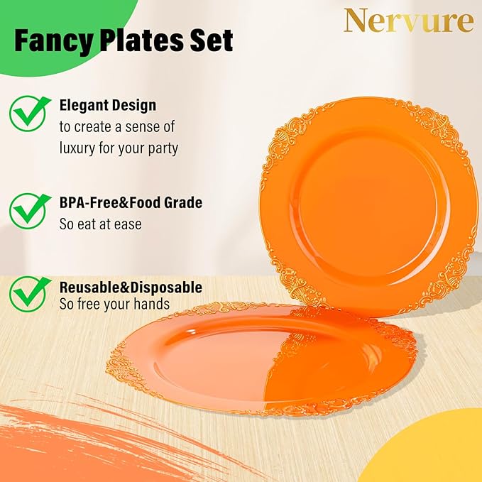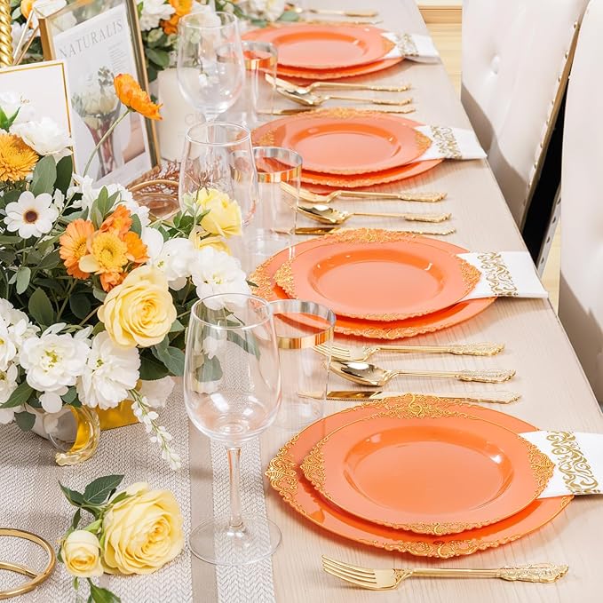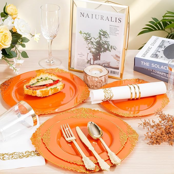 - DISPOSABLE OR REUSABLE: Orange gold plates are disposable dinnerware, it will be convenient for you to use, after you use, you can throw the gold plates into the trash can. You'll have more time to do other things, and of course, if you want to use the gold plastic plates again, they can be washed and used again.