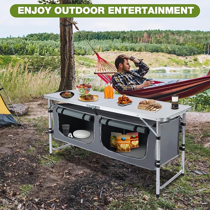 - [Generous Storage]----This outdoor folding table with two spacious 600D oxford zippered lockers ensures ample storage for food, drinks, and cutlery. Detachable storage bag for easy portability and storage.