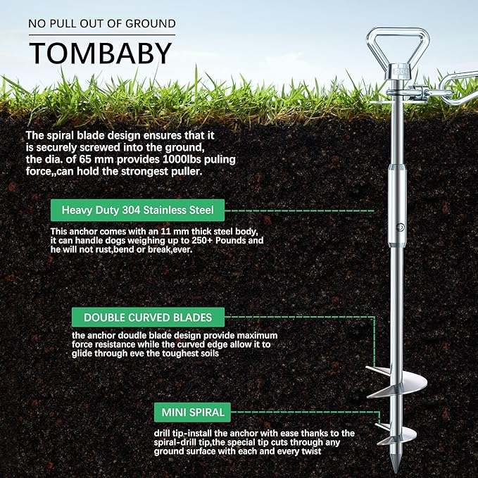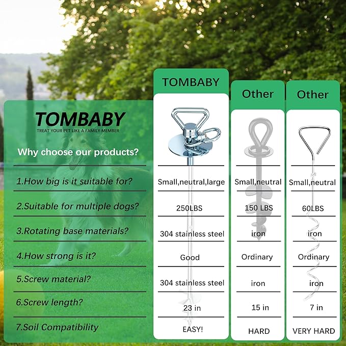 - NO MORE LET YOUR DOG GET LOST:Can you accept that the dog stakes can't be fixed in the ground and let your dog get lost? The TOMBABY dog stake is made of 304 stainless steel spiral design, 23 inches long, can be fixed in grass, beach, snow and land with small rocks (note: it can't be fixed in too soft ground), firmly fixed in the ground, so your puppy can't escape from you.On a sunny day, you can spend some carefree quality time in your yard or park without worrying about your puppy getting lost