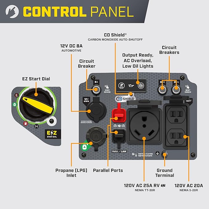 - Includes a 120V 25A TT-30R outlet, a 120V 20 A household duplex outlet (5-20R) with clean electricity (less than 3% THD), plus a 12V automotive-style outlet, and Parallel outlets