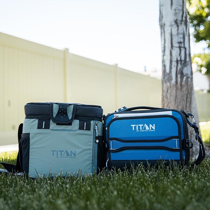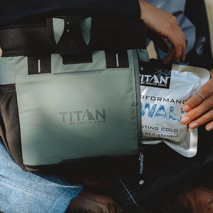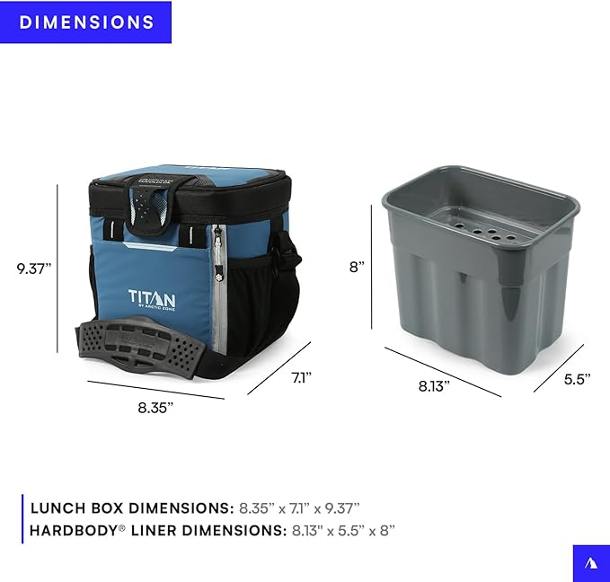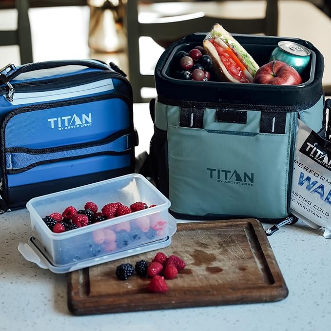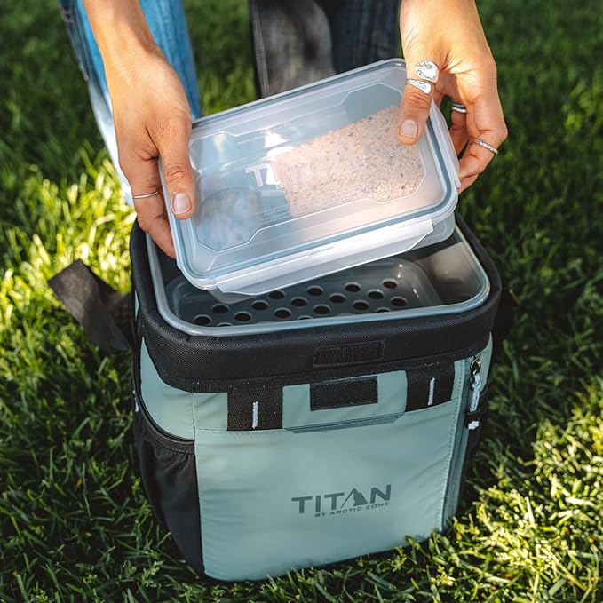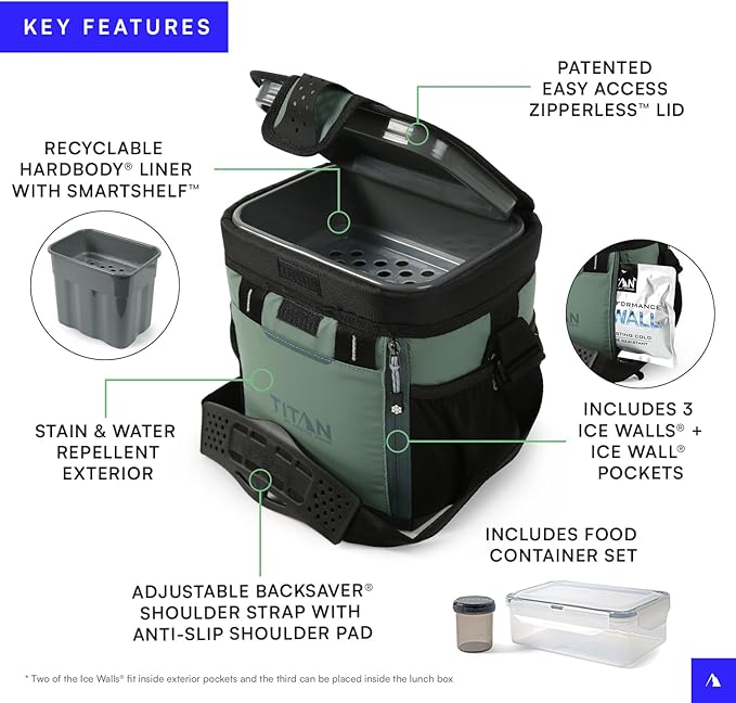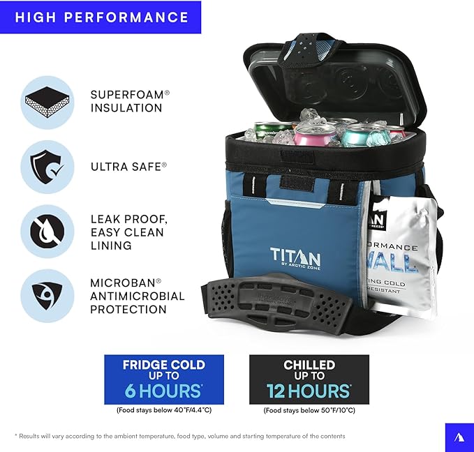 - FRIDGE COLD PERFORMANCE: Titan lunch box keeps items Fridge Cold (40°F/4.4°C) for up to 6 hours and chilled (50°F/10°C) for up to 12 hours*; Includes 3 High Performance Ice Walls (reusable ice packs) plus SuperFoam insulation
