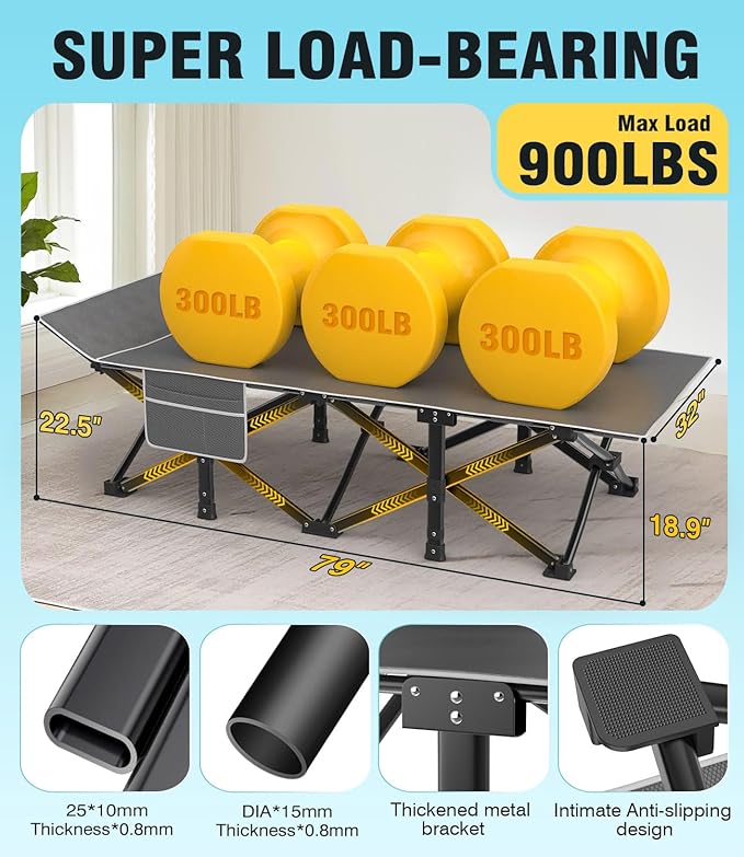 - Durable and Long-lasting--The upgraded version of the cot bed is made of double layer 600D Oxford cloth, designed with 10 tubular iron legs and 25mm thick square tubes to provide stability, featuring superb strength, supporting a max capacity of 900 pounds.