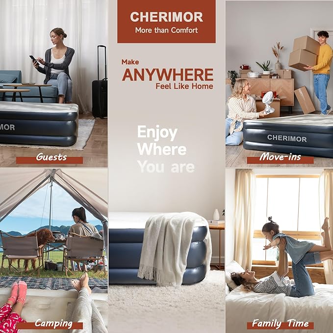 - Wide Applications for Your Convenience: It comes with a carrying bag for convenient portability and storage, simplifying the process of packing, transporting, and storing the inflatable bed. Whether for home use, travel, hosting guests, moving, or office needs, it meets your high-quality rest requirements anytime, anywhere. The CHERIMOR Air mattress ensures you sleep comfortably, wherever you are.