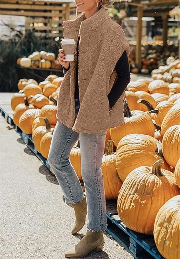 - Features: Stand collar, sleeveless, thigh-length, baggy style, side pockets, solid color, sherpa vest for women, casual loose fleece vest for women