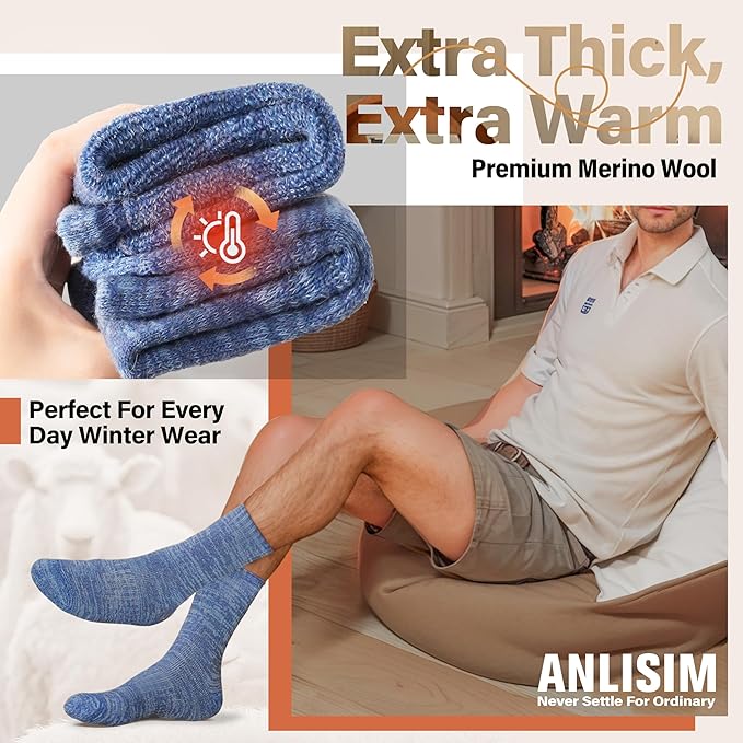 Anlisim Merino Wool Warm Boot Hiking Socks Thermal Extra Thick Winter Cozy Crew Comfy Cushioning Work Women Men Socks 4 Pairs
