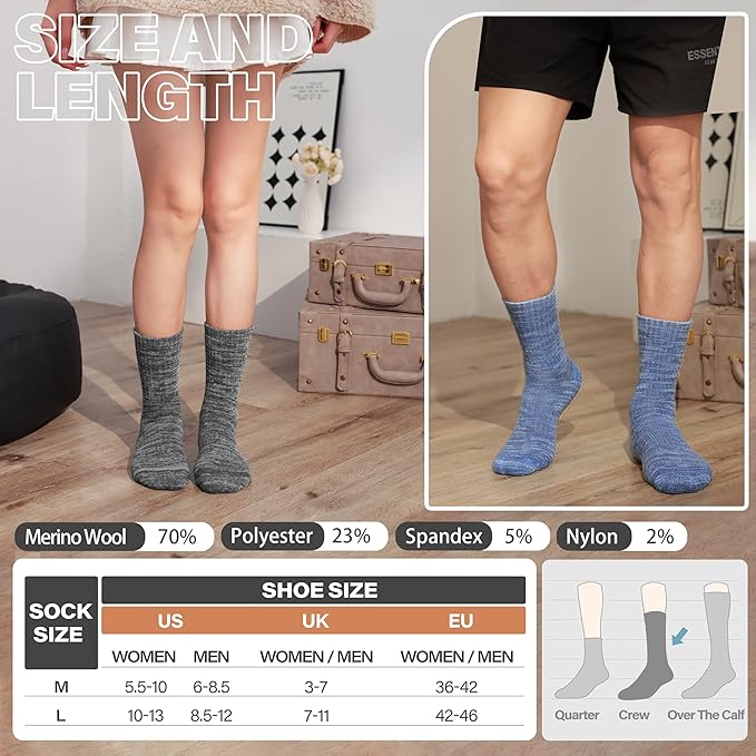 - Superior Warmth: Crafted with a blend of 70% merino wool,23% polyester, 5% spandex,and 2% nylon, these extra thick warm socks are your perfect companion for chilly days,ensuring toasty feet in any cold weather.