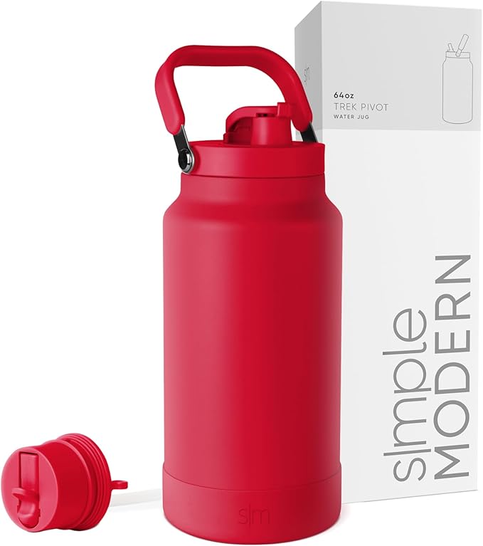 Simple Modern Trek Pivot | Half Gallon Water Bottle Jug with Handle & Boot | Interchangeable Straw & Chug Lids | Large Insulated Stainless Steel | Sports Camping Outdoors | 64oz, Ember Red
