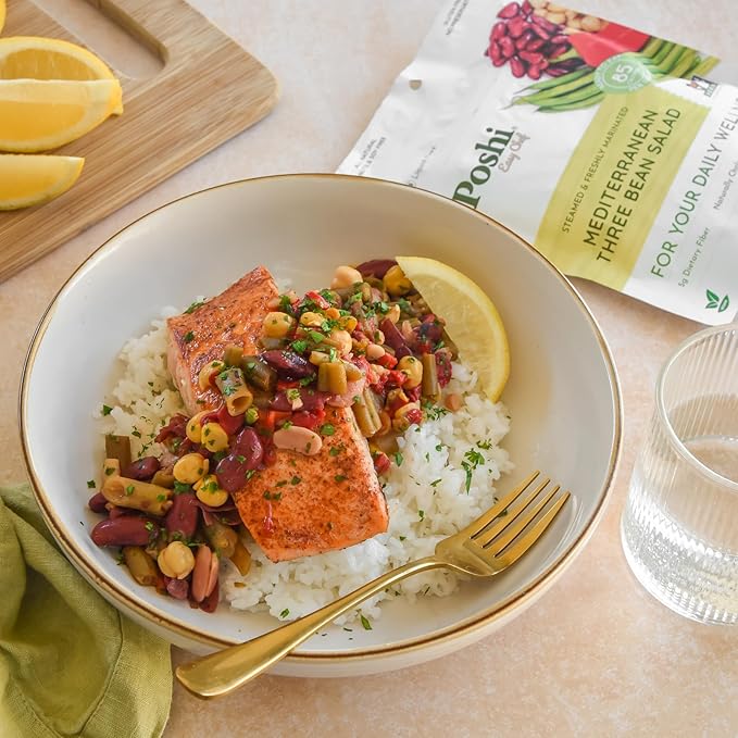 POSHI Mediterranean Three Bean Salad Natural, Keto, Vegan, Non GMO, Low Carb + Calorie, Gluten Free, Ready to Eat, Fully Cooked Vegetables, Pentry Food, Gourmet, Healthy, Travel Food 6 Pack, 4.4 oz