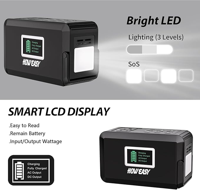 - Smart Displays and LED Lights:Mutifuction LCD display would show you the remaining energies/charge/discharge/AC output/DC output status. Ultra-bright LCD screen allows you to know the status of the portable laptop charger even when camping without a light source. 2) This portable charger power bank comes equipped with a 3-level brightness and SOS mode, Simply press the LED flashlight switch to adjust the brightness and activate the SOS mode, Whether you're camping in the great outdoors or dealing with a power outage, this portable charger will always light your way